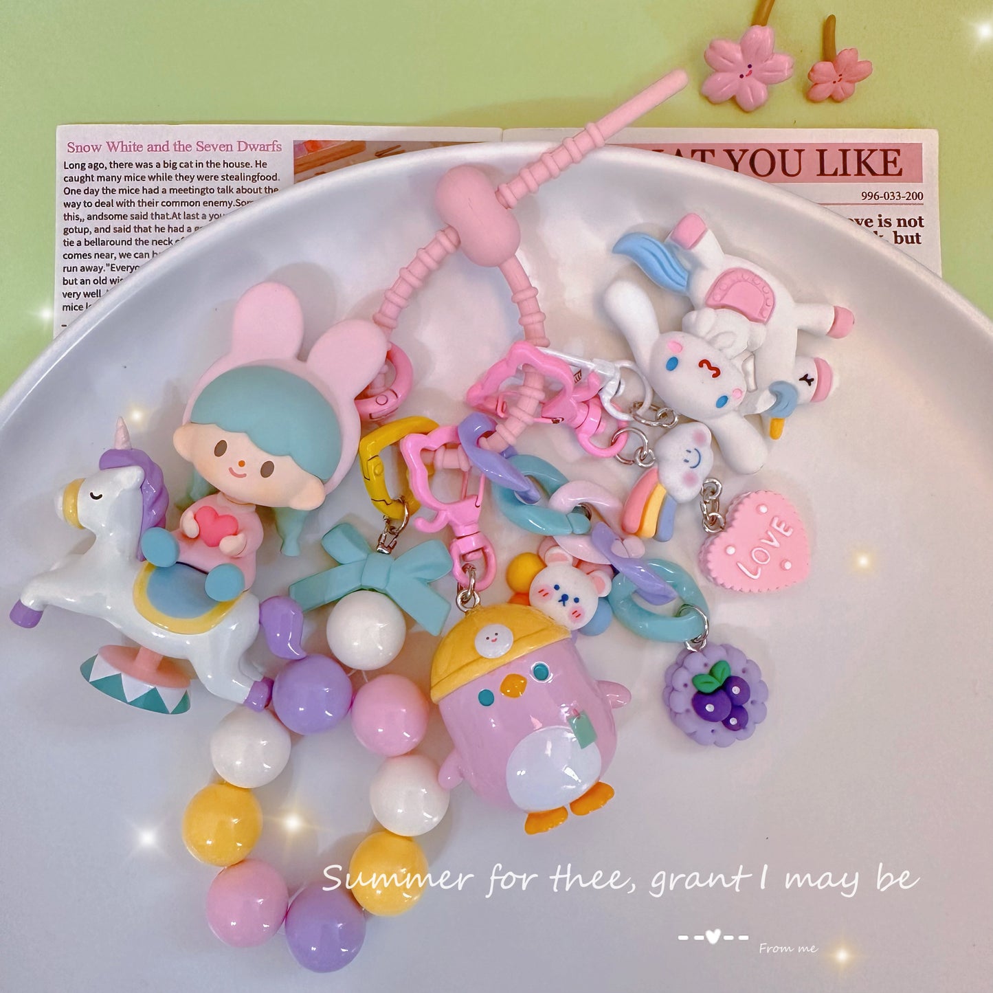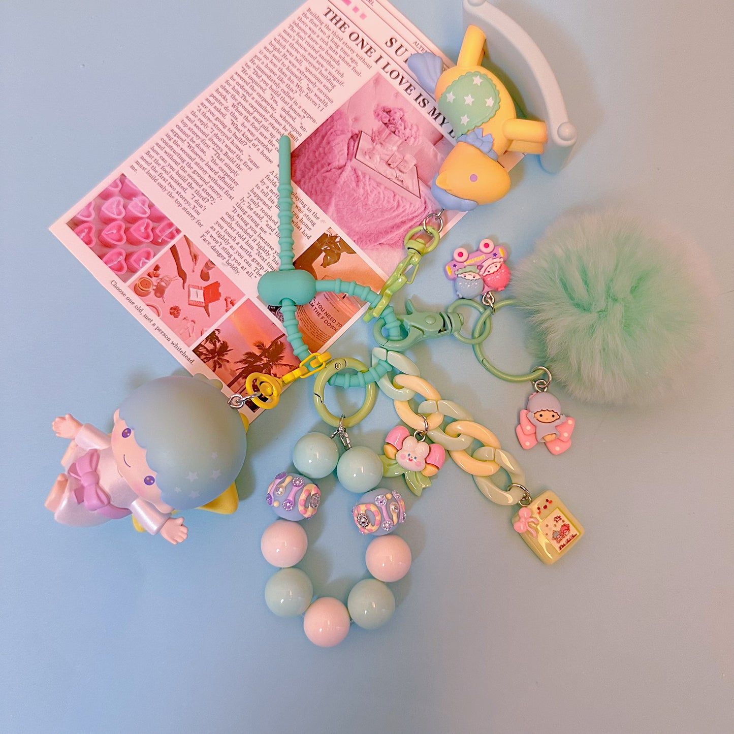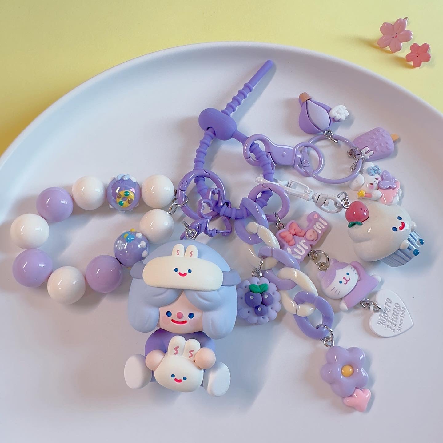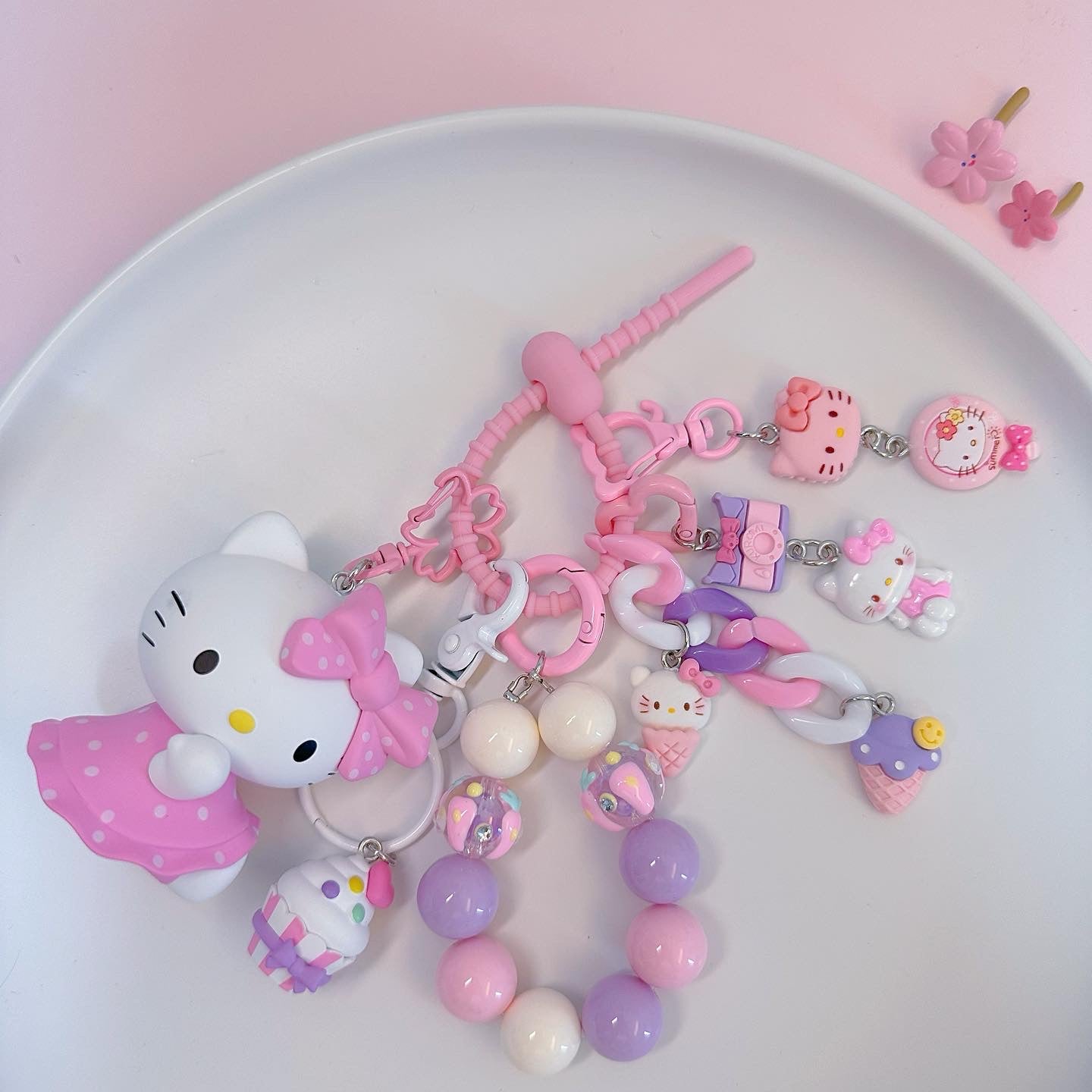 Hello, here ! This lovely key pendant is made by CloudDIY, please allow 5-7 days for preparation; It is strung together by different styles of charm, you can use it to hang on your bag, car upholstery, keychain decoration, very cute!